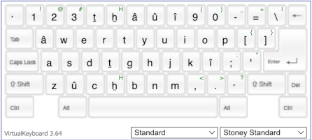 Selecting Stoney enables searching in the Stoney language. It also sets the alphabet to only include letters used in Stoney. Searching in Stoney will allow you to access dictionary entries directly. Click a letter to start browsing or start typing to search. A virtual Stoney keyboard appears at the bottom at the page and your keyboard becomes the Stoney keyboard as you start typing.